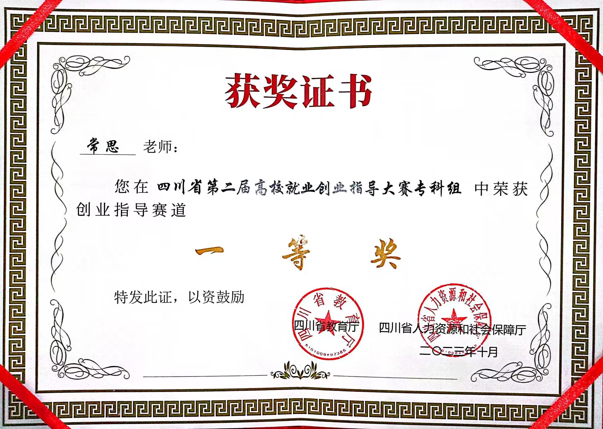 四川省第二届高校就业创业指导大赛专科组创业指导赛道一等奖(2