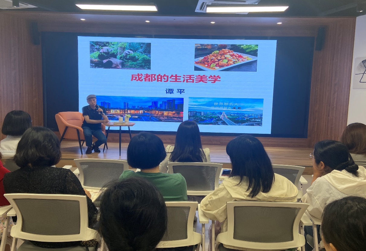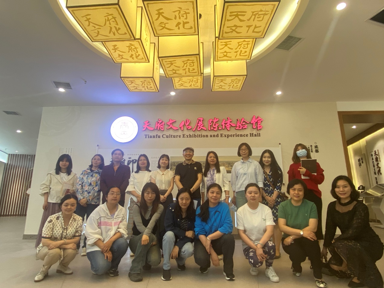 赖敏与老师们先后参观了天府文化展陈体验馆、中国-东盟艺术公司扎染、蜀绣、竹编、根雕等中华优秀传统文化非遗传承项目工作室;天府文化研究院经理谭平教授给老师们带来了以“成都的生活美学”为题的精彩讲座,共同探讨关于成都生活美学内涵等相关话题;双方围绕天府文化传承与弘扬、课程建设、团队队伍建设和教科研项目开展了深入交流。