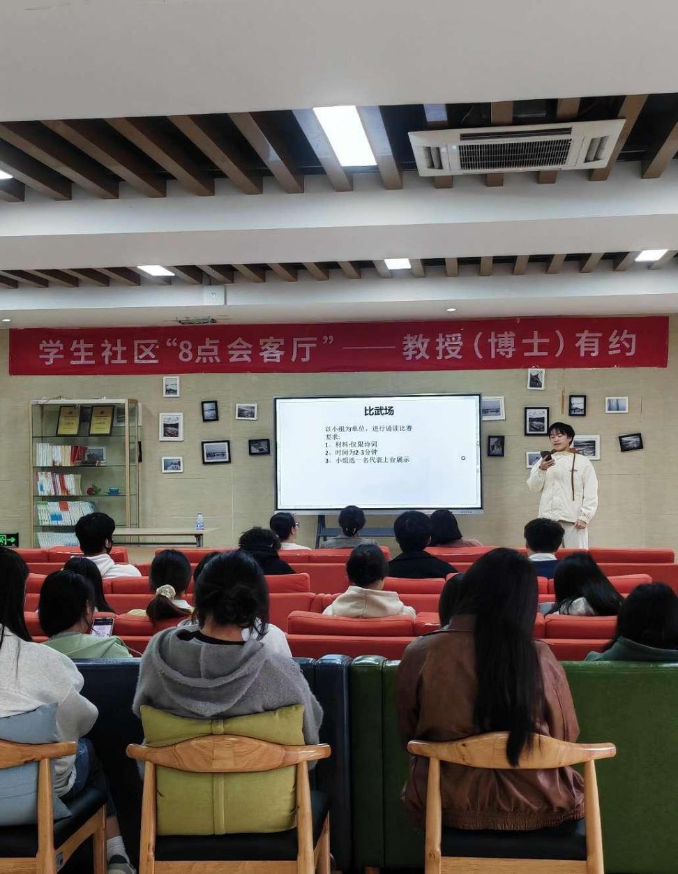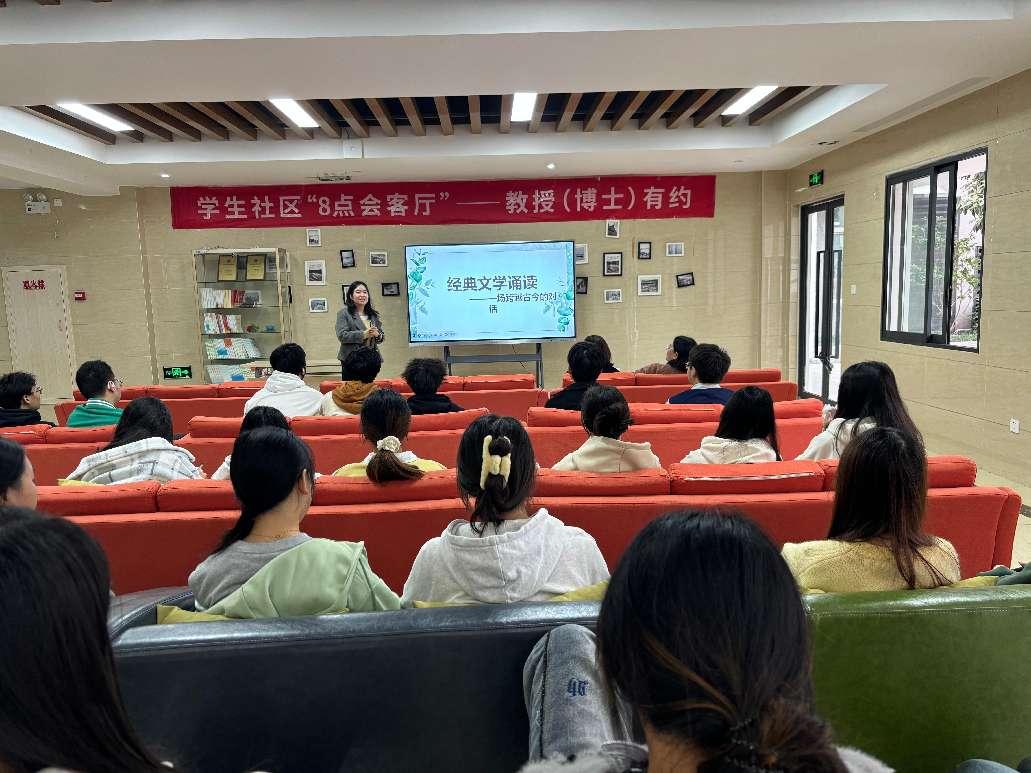 11月13日,mk体育代平老师深入“一站式”员工社区,开展了一场别开生面的经典文学诵读活动,语文教研室王海燕、曾德静、隋莉莉参加了本次活动。